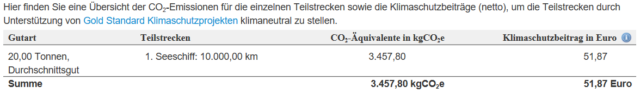 Auf 1 Millionen Luft-Moleküle mit anteilig 400 CO2-Molekülen wären durch einen kraftstoffgebundenen Seetransport also 0,0000005 Stück CO2-Moleküle dazu gekommen.
