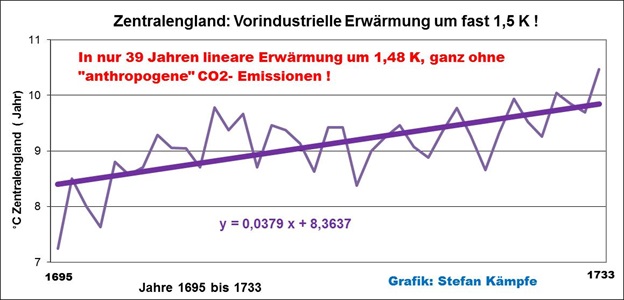 Außerdem verschweigt man der Bevölkerung die großen Temperaturanstiege der vorindustriellen Zeit. Im frühen 18. Jahrhundert waren die menschlichen CO2- Emissionen vernachlässigbar gering. Trotzdem findet sich in der sehr seriösen Messreihe aus Zentralengland (CET) ein schönes Beispiel, wie stark die Lufttemperaturen innerhalb von nur 4 Jahrzehnten gestiegen sind: