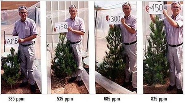 In der Abbildung links wuchs der Baum in einem abgeschlossenen Gewächshaus bei einem CO2-Pegel von 385 ppm, wie er noch vor kurzem auf dem Mauna Loa gemessen wurde. Bereits bei einer Zunahme um 150 ppm auf 535 ppm ist ein deutlicher Zuwachs im Wachstum zu erkennen. Bei einer Zunahme auf 835 ppm, also mehr als dem doppeltem heutigen Wert, was etwa dem Verbrennen sämtlicher, heute bekannter und förderbarer fossiler Brennstoffe entspräche, ist der Baum zu beachtlicher Größe heran gewachsen. Er ist im gleichen Wachstumszeitraum auf die doppelte Größe gewachsen, als bei einer CO2-Konzentartion von 385 ppm.