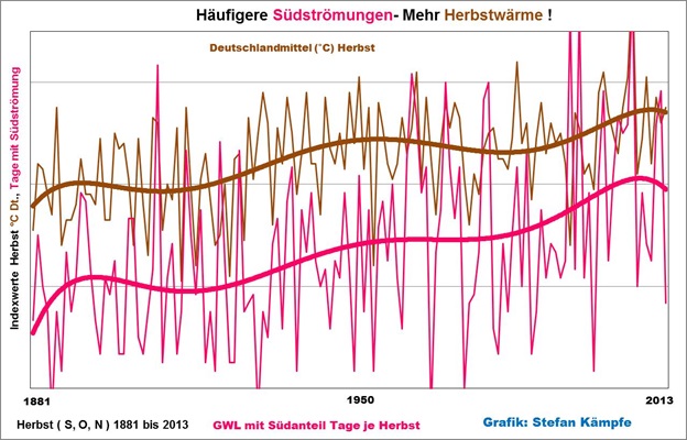 Die Zunahme der Sonnenscheindauer hatte zwei wesentliche Ursachen, erstens eine höhere Sonnenaktivität am Ende des 20. Jahrhunderts, welche über den „SVENSMARK- EFFEKT“ die Bildung tiefer Wolken und von Nebel verringerte; zweitens Luftreinhaltemaßnahmen, welche ebenfalls die Wolken- und Nebelbildung verringerten und die Durchlässigkeit der Luft für die kurzwellige Einstrahlung erhöhten. Im Herbst lässt aber der Einfluss der Sonnenscheindauer auf die Lufttemperaturen stark nach; doch findet sich hier eine andere, plausible Erklärung für die Erwärmung, welche sich sogar bis an den Beginn regelmäßiger Temperaturaufzeichnungen (1881) zurückverfolgen lässt- die Zunahme von Großwetterlagen (GWL) mit südlichem Strömungsanteil, wie wir es in den letzten Tagen wieder beobachten konnten: