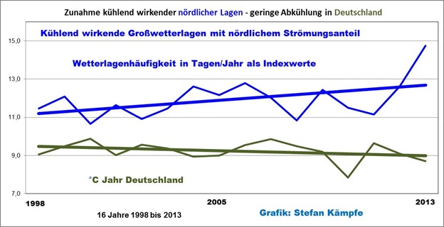 Grundsätzlich gelten diese Zusammenhänge in allen Jahreszeiten mit wechselnder Dominanz. Der Zusammenhang zwischen der Häufigkeit bestimmter Großwetterlagen und den Jahresmitteln der Lufttemperatur in Deutschland vermag sogar die leichte Abkühlung der vergangenen 16 Jahre in Deutschland zu erklären: