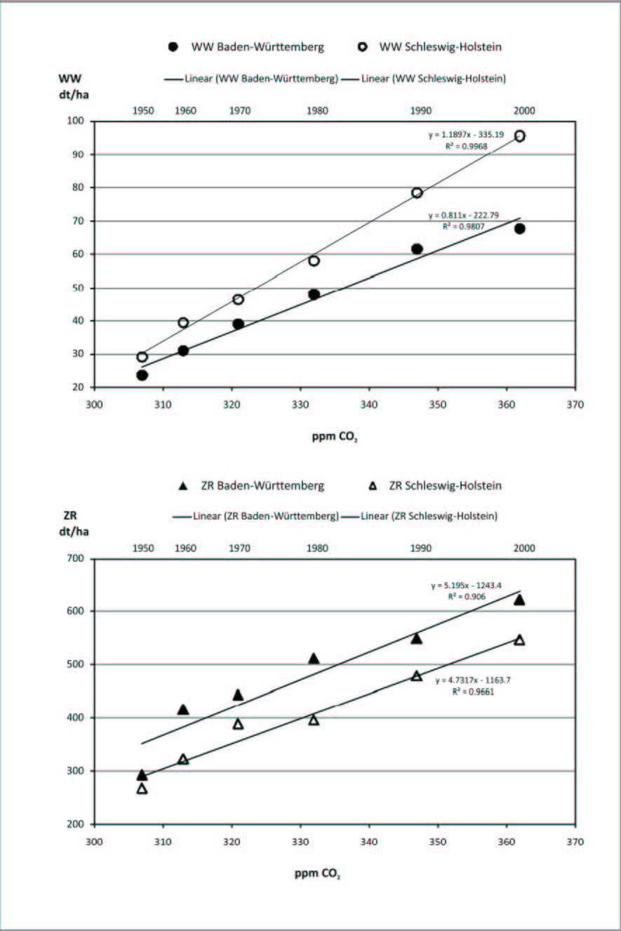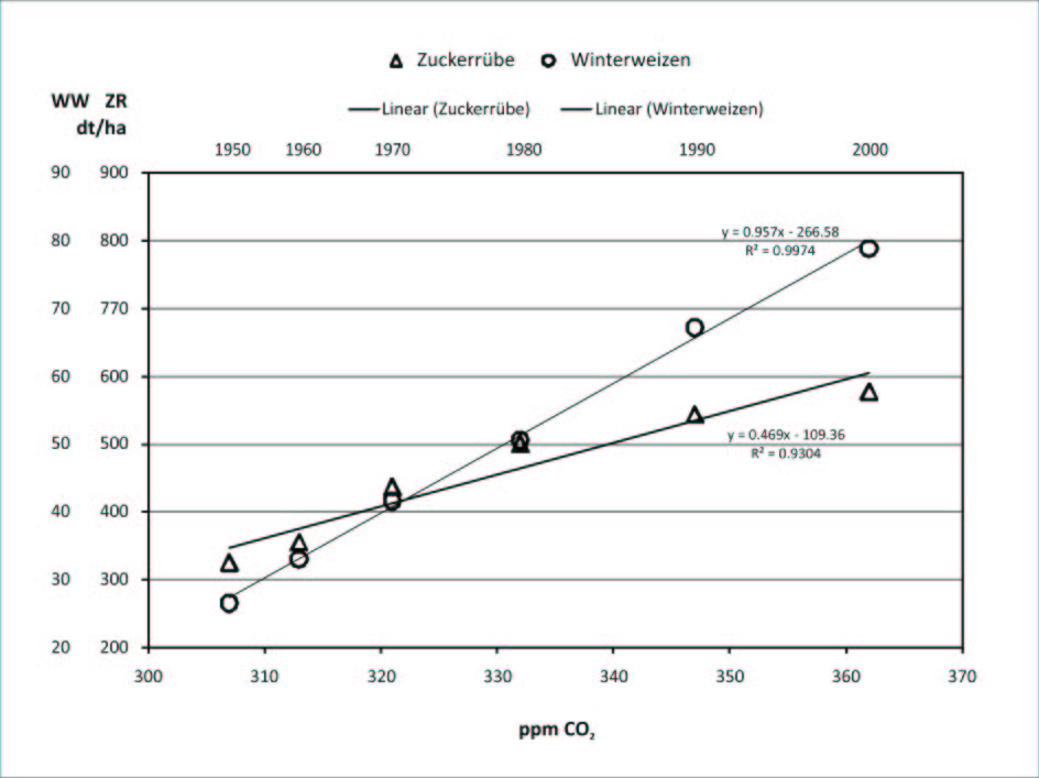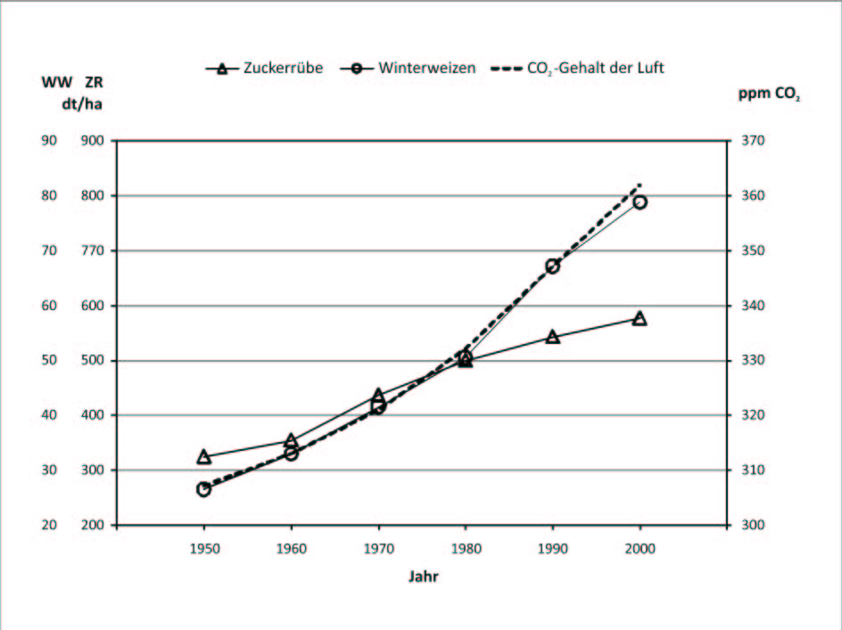 Aus den Darstellungen in Abbildungen 1 und 2 ist zwingend zu folgern, dass der steigende CO2-Gehalt die Erträge von W-Weizen und Z-Rüben entscheidend beeinflusst hat. An der Plausibilität besteht kein Zweifel; denn: