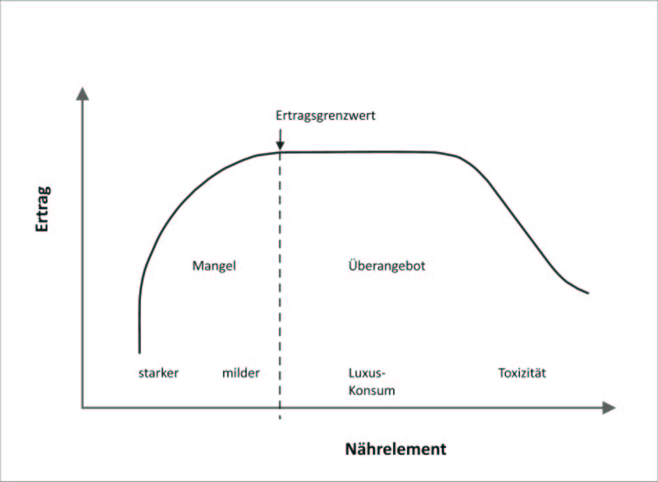 Die Relationen zwischen Versorgung mit Nährelementen und Wachstumsfaktoren zum Ertrag zeigt Abb. 4. Bei starkem Mangel bewirkt bereits eine geringe Verbes serung der Zufuhr einen starken Anstieg des Ertrages. Dieser nimmt mit zuneh mender Sättigung bis zum Ereichen des Ertragsgrenzwertes ab. Überver sorgungen führen zum nicht ertragswirksamen Luxuskonsum und wirken bei stark überhöhtem Angebot toxisch mit Verminderung von Ertrag und Qualität.