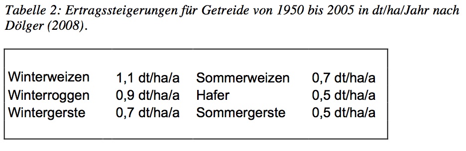 Die für W-Weizen und Z-Rüben gezeigten Ertragssteigerungen von 1950 bis 2000 sind auf andere Getreidearten übertragbar, wie Ertragsauswertungen von Dölger (2008) für die übrigen Getreidearten ergeben. Sie liegen bei Wintergetreidearten deutlich höher und unter den Getreidearten spricht Weizen am stärksten auf die verbesserte CO2-Ernährung an (Tab. 2).