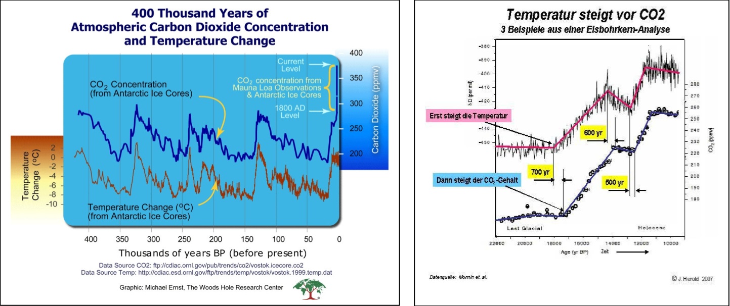 2) Leider ist die 2. Graphik nicht genau genug, um die 800 Jahre, die die Temperatur dem CO2-Gehalt vorrauseilt, zu sehen. Kann man an die Daten kommen, die der Graphik zugrunde liegen?