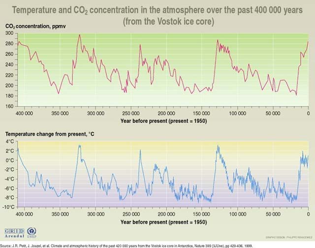 Beispielsweise diese Grafik lässt keinerlei kausalen Zusammenhang zwischen der CO2Konzentration in der Atmosphäre und der durchschnittlichen globalen Temperatur erkennen.