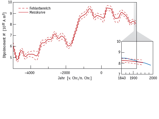 Auch heute findet übrigens eine Fluktuation des Erdmagnetfeldes statt, wie aus S.d.W. 09/05, S. 54 “Geheimnisvoller Geodynamo“ zu entnehmen ist und die daraus entnommene Abbildung zeigt: