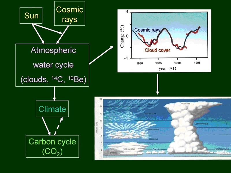 Durch erhöhte solare Aktivität (z.B. Sonnenfleckenzyklen, magnetischer de Vries/Suess-Zyklus) wird die Erde besser vor kosmischer Strahlung abgeschirmt, weshalb die 14C-Menge abnimmt. Auf diese Weise spiegelt die 14C-Schwankung z.B. in Baumjahresringen die solare und kosmische Variabilität wieder. Wie bereits geschildert, bilden sich auf diese Weise im unteren Atmosphärenbereich optisch dichte Wolken. Eine Verstärkung der unteren Wolkenbildung sorgt so für globale Kühlung. Dies trifft zusammen mit einer schwachen, inaktiven Sonne, wodurch vermehrt kosmische Strahlung (Schutz des solaren Magnetfeldes ist geringer) die Erdatmosphäre erreicht. Nach den Angaben des DLR (Deutsches Zentrum für Luft- und Raumfahrt) bedeutet eine Reduzierung des mittleren Wolkenbedeckungsgrades von wenigen Prozent, bereits eine globale Temperaturänderung, die (Anmerkung: in den Modellen) einer Verdopplung des CO2-Gehaltes entspricht. (http://www.oekologismus.de/?p=460)