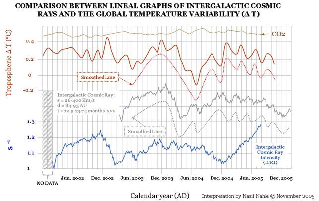 Die unteren drei Graphen in Abbildung 11 zeigen die kosmische Strahlung im Zeitraum von März 2002 – 2005. Die beiden roten Graphen die Temperaturschwankungen im gleichen Zeitraum. Werden die beiden geglätteten Linien verglichen, wird der Zusammenhang zwischen Temperaturgang und kosmischer Strahlung sehr deutlich. Zum Vergleich ist die CO2-Schwankungsbeite dargestellt, die keinerlei Übereinstimmung mit der Temperaturvariabilität aufweist, Quelle: (http://biocab.org/Cosmic_Rays_Graph.html).