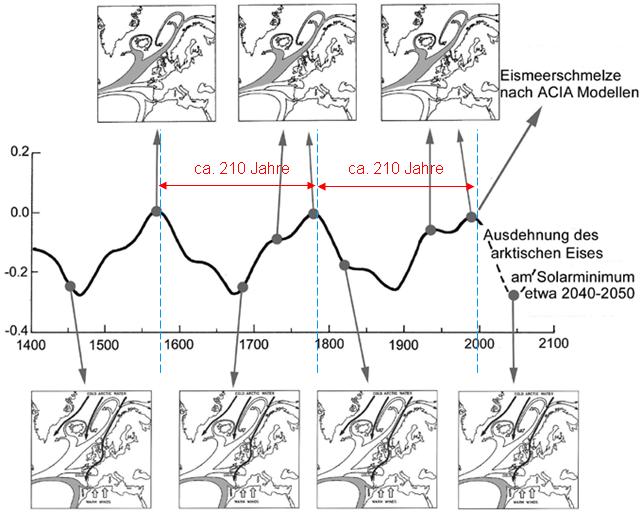Die Abbildung 12 zeigt die variable arktische Eisbedeckung von 1400 – 2008 (Quelle: Dr. Axel Mörner, „Keine Gefahr eines globalen Meeresspiegelanstiegs“) und die damit verbundenen Meeresströmungen im Nordatlantik. Sehr deutlich zeichnet sich in der arktischen Eisbedeckung der im Mittel 208-jährige magnetische de Vries/Suess-Zyklus der Sonne ab, der um die Jahrtausendwende sein letztes Maximum hatte und seitdem wieder fällt, so dass von weiter fallenden Temperaturen bis zur Mitte des Jahrhunderts zu rechnen ist.