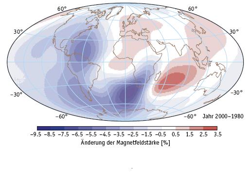 So konnten auch Satelitenmessungen die weitere Abnahme des Erdmagnetfeldes bestätigen, wie die folgende Abbildung zeigt.