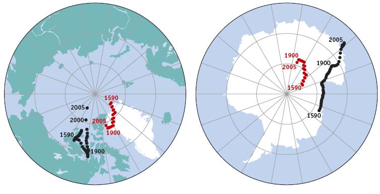 Die Abbildung zeigt die Positionen der magnetischen (schwarz) und geomagnetischen Pole (rot) auf der Nord- und Südhalbkugel con 1590 – 2005. Es sind jeweils 10-Jahresschritte aufgetragen. Fast spektakulär wandert der seit 500 Jahren recht stabile magnetische Nordpol mit großer Geschwindigkeit in Richtung Sibirien, Quelle: GFZ-Potsdam. Der geomagnetische Pol ist ein theoretischer (berechneter) Pol des Erdmagnetfeldes, dem die Annahme zu Grunde liegt, im Erdmittelpunkt befände sich ein Stabmagnet.