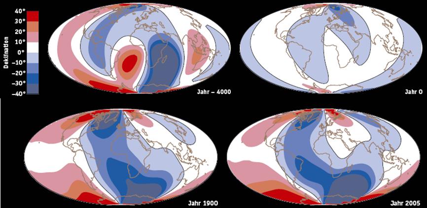 Die Abbildung 4 (Quelle: Sterne und Weltraum, Juni 2006) zeigt die Deklination 4.000 v.Chr, Jahr 0, 1900 und 2005. Wird dieses mit der Abbildung 1 verglichen, fällt auf, dass in Zeiten geringer Deklination das Erdmagnetfeld hoch und in Zeiten hoher Deklination vergleichweise niedrig ist, bzw. schnell abnimmt.