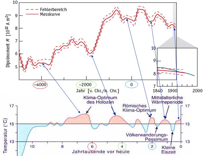 Wird die Abbildung der Magnetfeldstärke mit der Temperaturkurve im Holozän verglichen, wird sichtbar, dass die Temperaturmaxima mit den Minima des Erdmagnetfeldes übereinstimmen, was für die Richtigkeit der Aussage der Cambridge University Press (Bryant E. (1997): Climate process & change) spricht.