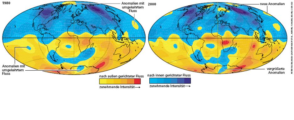 Die Abbildungen 7 zeigen das sich ändernde Erdmagnetfeld im Zeitraum von 1980 – 2000, sowohl die Intensität der Flussänderung, als auch die Polarisation des Flusses. S.d.W.: “Der größte Teil des Erdmagnet-feldes verlässt den Kern durch die südliche Hemisphäre und tritt durch die Nordhalbkugel wieder ein. Doch an manchen Stellen ist es umgekehrt. Diese Anomalien mit umgekehrtem Fluss haben sich zwischen 1980 und 2000 weiter ausgedehnt.“ (Anmerkung: In dieser Zeit wurden auch die ansteigenden Globaltemperaturen gemessen). “Wenn sie beide Pole umschließen, könnte dies eine Polumkehr bewirken.“