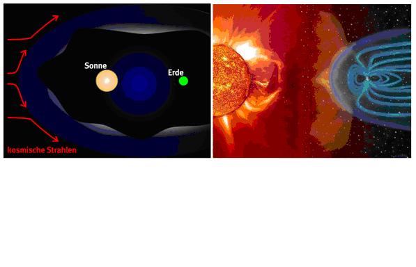 Die Abbildung 8 links zeigt, wie die kosmischen Strahlen durch das solaren Magnetfeld abgelenkt werden und dadurch die Erde nicht erreichen, bzw. deren zeitliche Flussgröße bei aktiver Sonne geringer ist. In der Abbildung rechts sind die Auswirkungen des solaren Magnetfeldes und des sog. Sonnenwindes auf das irdische Magnetfeld schematisch dargestellt.