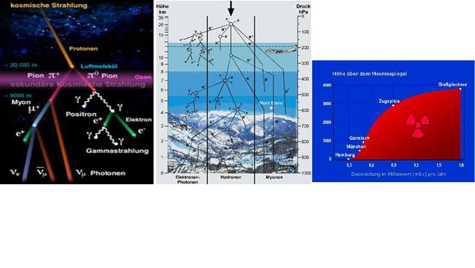 Die Abbildungen 9 zeigen die Teilchenreaktionen aufgrund der kosmischen Strahlung und deren Anteil (Millisievert) in Abhängigkeit zur Höhe in Metern (rechts). Quelle: Forschungszentrum Dresden