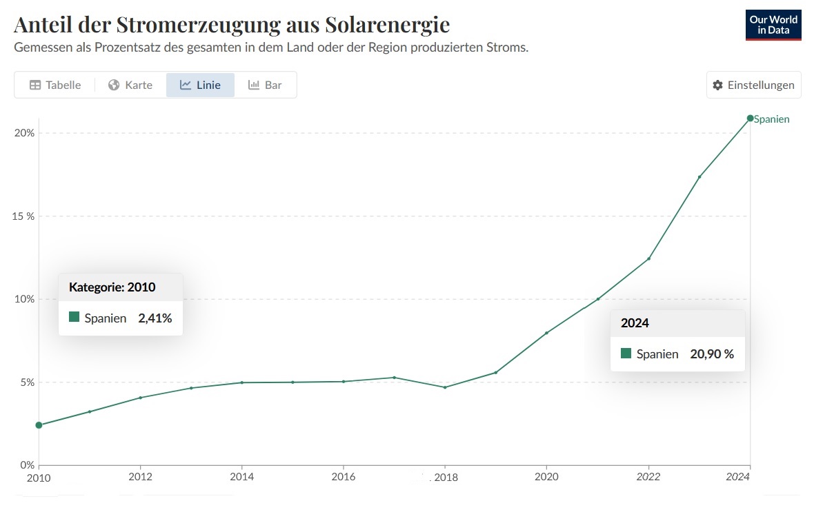2010 nur ca. 2% PV-Strom in Spanien und 2024 ca. 21%