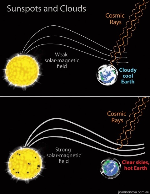 Vereinfachte Darstellung der Beziehung zwischen GCR und Wolkenbildung auf der Erde. Bild: Jo Nova