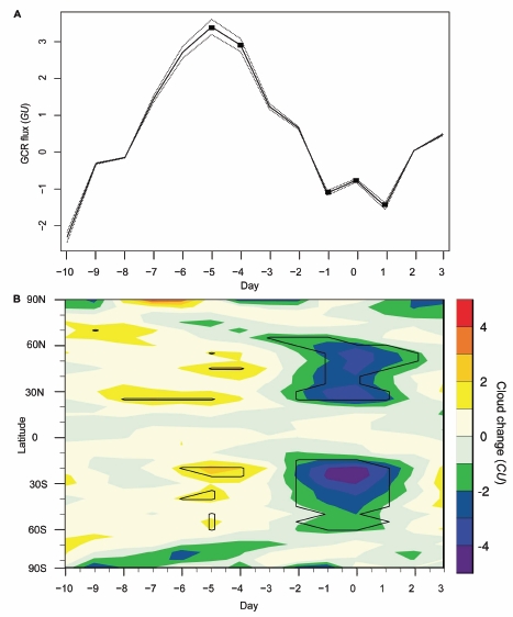 Abb. 2. (A) Kurzfristige Änderungen der GCR (Die Markierungen deuten die Signifikanz an) und (B) anomale Änderungen der Bewölkung (Signifikanz hier markiert durch die durchgezogenen Linien), zusammengefasst über die ganze Periode. Die GCR-Daten wurden mit multiplen Neutronendetektoren gewonnen, die Variationen wurden im Vergleich zu Änderungen während eines Schwabe-Zyklus‘ vereinheitlicht. Die Änderung der Bewölkung wurde über die Troposphäre (30 – 1000 hPa) gemittelt aus Daten [des Satellitensensors] ISCCP D1 im infraroten Bereich.