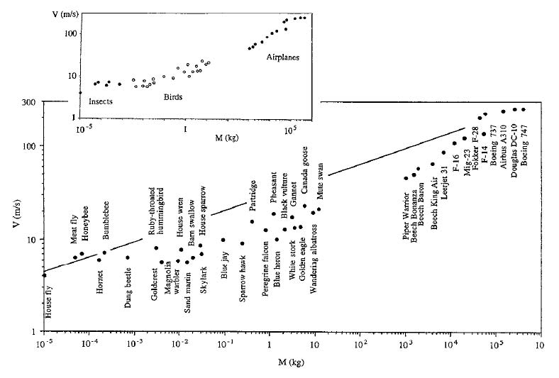So hat man eine vertikale Komponente, die potentielle Energie (beim Fluss war es das Versickern), und eine horizontale, den Luftwiderstand (oben das Fließen), unter der Randbedingung möglichst wenig Energie (Treibstoff beim Flugzeug, Futter bei den Tieren) auf möglichst großer Distanz, zu optimieren. Macht man nun die sehr vereinfachende Annahme, dass die Dichte des fliegenden Objektes gegeben ist durch p ~ M/L3, wobei M die Masse und L eine lineare Dimension ist, so findet man für die optimale Geschwindigkeit vopt proportional 30 x M1/ 6, wobei die Geschwindigkeit in m/s und die Masse in kg gegeben sind.. Dies ist als Gerade in der nächsten Graphik abgebildet.