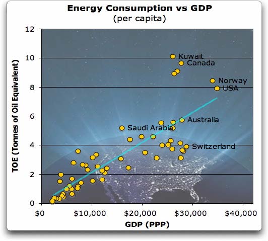 Höherer Energieverbrauch bedeutet auch höheren Wohlstand. Den Verbrauch von Energie zu reduzieren, z.B. in dem man sie verteuert, bedeutet somit auch den Wohlstand zu verkleinern. Aber, kann man hier einwenden, dies muss nicht der Fall sein, da man dies auch durch Verbesserung der Effizienz erreichen kann. Richtig, dies wurde und wird aber ständig gemacht. Aber es gibt einen entscheidenden Unterschied. Die Effizienz hat einen nicht erreichbaren maximalen Grenzwert von Eins. Und trotz aller Fortschritte stieg der Energieverbrauch ständig an.