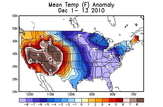 Die Kälteanomalie hat sich im November fortgesetzt und in der ersten Hälfte des Dezember noch verstärkt. Zusammen mit dem ungewöhnlich kalten Winter 2009/2010 in den Mittleren Breiten der Nordhemisphäre hat die Kältewelle zu weit verbreiteten Kommentaren geführt, dass die globale Erwärmung geendet hat. Dies ist aber nicht der Fall“.*