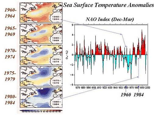 Wenn die AMO positiv ist mit warmem Wasser im Nord- sowie dem tropischen Atlantik, war die NAO überwiegend negativ (wie in den sechziger Jahren). Als der Nord- und tropische Atlantik in den achtziger Jahren in die Kaltphase wechselten, war die NAO hauptsächlich positiv (Datensatz in der oben stehenden Karte für das Jahr 1999). Man beachte den Sprung der AMO in die positive (warme) Phase im Jahre 1995 mit einer markanten Abnahme der NAO. Betrachte die inverse Beziehung mit der AO in der unten stehenden Graphik. In beiden Darstellungen sind die Werte von Dezember bis März gemittelt und standardisiert worden.