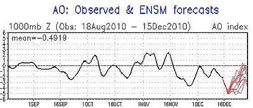 Bisher in diesem Spätherbst war die AO überwiegend negativ und soll den Ensemble-Rechnungen der Modelle zufolge während der nächsten Tage 5 Standardabweichungen [?] negativ ausfallen.
