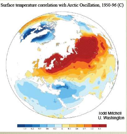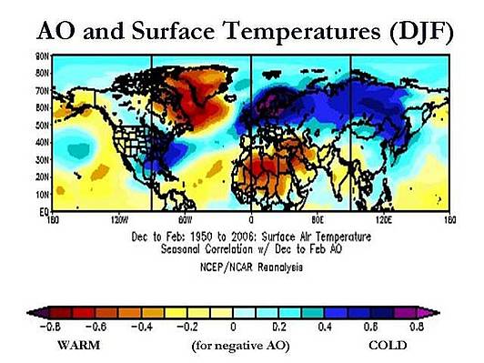 Eine positive AO würde zu steigenden Temperaturen auf den Kontinenten der Nordhemisphäre führen, während gleichzeitig kalte Luft in der Arktis gefangen wäre, deren Bereich nicht weiter südlich als bis nach Nordkanada und dem Gebiet der Hudson Bay reichen würde. Die folgende Abbildung zeigt die Wärme in Eurasien.