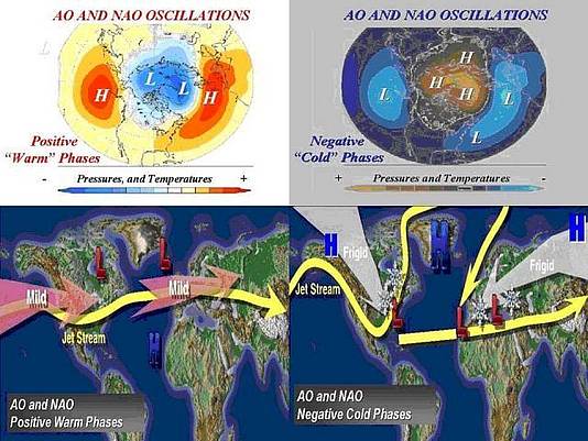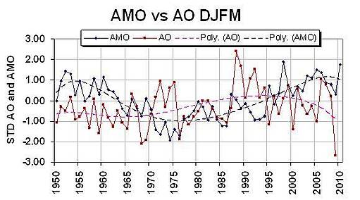 Wie bekannt, variiert die Nordatlantische Oszillation, eine wichtige Komponente der gesamten arktischen Oszillation, mit der Temperaturschwingung im Atlantik, bekannt unter dem Namen AMO oder Atlantische Multidekadische Oszillation. Befindet sich der Atlantik in der warmen positiven Phase der AMO, wie es gegenwärtig der Fall ist, tendieren die NAO und die AO dazu, in der negativen Phase zu sein.