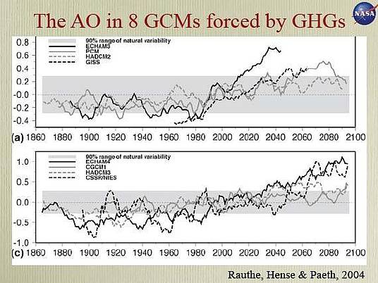 Die Treibhausgasmodelle nehmen alle eine Zunahme von Häufigkeit und Stärke einer positive arktischen Oszillation an, die meist (zu etwa 2/3) die 90%-Marke natürlicher Variabilität überschreiten soll.