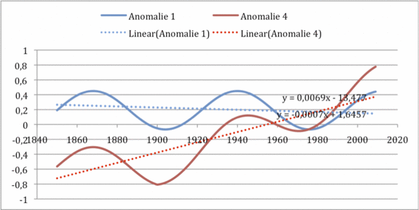 Machen wir dazu die Probe aufs Exempel, indem wir einen Anomalienverlauf aus einem (künstlichen) sinusförmigen Temperaturverlauf von 1850 bis 2009 erzeugen. Blau sei der Anomalienverlauf ohne Fehler. Die Anomalie verläuft fast gradlinig, wie die blaue Trendlinie anzeigt. Ab 1940 wird nun ein Fehler von + 1 K eingefügt. Gemäß Rechenanweisung w.o. wird dann aus beiden Werten für alle Jahre (x) die Differenz gebildet. Ab 1940 hebt sich der Fehler auf. Beide Verläufe gehen ineinander über. Vor 1940 jedoch wird allein durch den Rechenprozess die Temperaturanomalie um 1 k abgesenkt. Wir sehen, die Annahme von vorhin gilt nur für die Zeit nach 1940. Vorher nicht. Lässt man Excel eine Trendgerade durch diese Werte legen, dann sehen wir, dass sich beide erheblich unterscheiden.