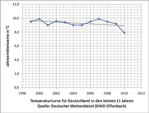 10 Jahren wegen eingetretener Sonnenfleckenflaute eine meßbare Abkühlung eingetreten. In nachfolgender Grafik mit Originaldaten des Deutschen Wetterdienstes ist dies deutlich zu erkennen (siehe vor allem das Rekordtief des vorigen Jahres). Warum hat Herr Koßmann in Kapitel 1.4 nicht auf den obigen Sachverhalt hingewiesen und seine Temperaturkurve in Abb. 1 auf Seite 21 schon früher auslaufen lassen? Er konstatiert dort sogar ganz im Gegenteil in diesem letzten Zeitabschnitt eine tendenzielle Temperatursteigerung (siehe seine rot gepunktete Linie).
