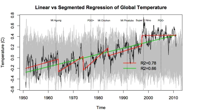 Im mittleren Teil der Abbildung 1 sieht man im Modell die strukturellen Brüche im Datensatz von CRU, wobei die optimale Anzahl der Brüche im Minimum des Bayesian Information Criterion (BIC) (untere Darstellung) liegt. Die zeitliche Position der Brüche geht (mit einer gewissen Verschiebung) einher mit markanten Ereignissen: Ausbrüche der Vulkane Mt Chichon und Pinatubo, die bis in die Stratosphäre reichten, dem Super El Niño und der Phasenänderung des Pazifischen Dekadischen Oszillation PDO im Jahre 2005.