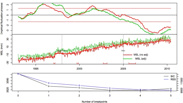 Abbildung 3: Der Fluktuationsprozess, das Modell struktureller Brüche und Messungen des globalen Meeresspiegels, sowohl barometrisch als auch nicht-barometrisch justiert.