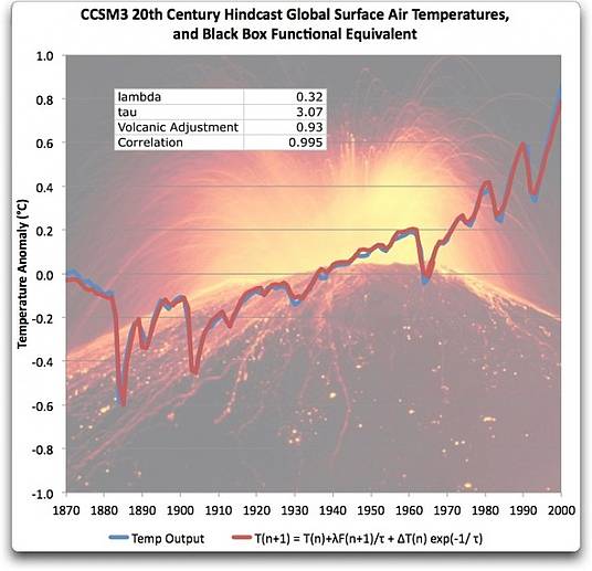 Nun, erst einmal bedeutet es, dass die Output-Temperatur des CCSM3-Modells ebenso wie beim GISSE-Modell funktional äquivalent zu einer einfachen, eindimensionalen zeitlich verzögerten linearen Transformation der Input-Antriebskräfte ist.