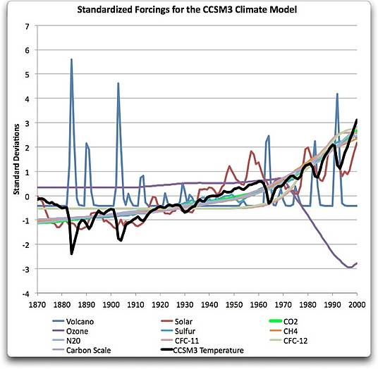 Abbidlung 2. Standardisierte Antriebskräfte, die vom Klimamodell CCSM 3.0 verwendet wurden, um eine Rückschau der Temperaturen des 20. Jahrhunderts zu erhalten. Dunkle schwarze Linien zeigen den Temperaturverlauf, wie ihn das Modell CCSM 3 sieht.