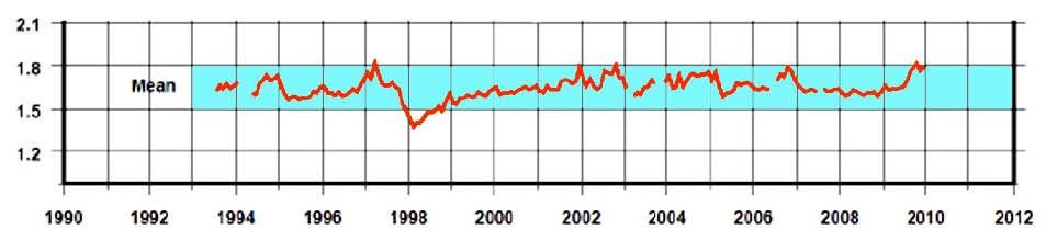 Abbildung 1: Die Gesamtaufzeichnung der Tidenhöhe seit 1978 in Tuvalu (aus Mörner 2010). Seit 1985 gibt es keinerlei Anzeichen für irgendeine Art von Meeresspiegelanstieg. Drei markante ENSO-Ereignisse mit jeweils signifikantem Rückgang der Höhe des Meeresspiegels zeigen sich 1983, 1992 und 1998.
