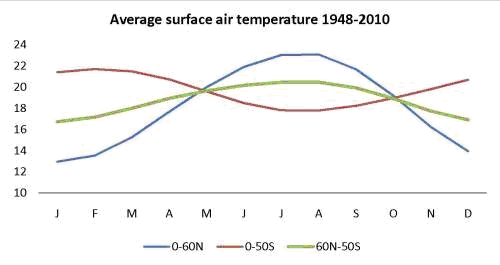 Allerdings sorgt die Tatsache, dass die südlichen Ozeane im Januar der Sonne näher sind und die Strahlung 7% stärker ist als im Juni, dafür, dass der Globus wärmer wird, weil der Ozean Wärme eher absorbiert und speichert als sie in die Atmosphäre abstrahlt, von wo sie rasch innerhalb des 24-Stunden-Zyklus im Weltraum verschwinden würde.