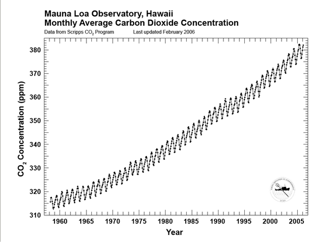 Dann besah ich mir den CO2-Anteil in der Atmosphäre, wobei ich eine große Prozentzahl vermutete, vielleicht 3 oder 4 oder sogar 5 Prozent. Die Graphen, die ich fand, sahen auf den ersten Blick falsch aus. Der CO2-Gehalt lag nicht einmal annähernd bei 5 Prozent. Nicht einmal 1 Prozent. Er lag so niedrig, dass er in Parts per Million gemessen wurde! Etwa 365 ppm habe ich gefunden, und eine Zunahme um etwa 2 ppm pro Jahr. Die Messungen reichten zurück bis zum Jahr 1959, und was mich noch mehr erstaunte – diese 365 ppm wurden auf knochentrockener Basis gemessen. Dies bedeutet, dass das als Beispiel dienende Luftpaket gedörrt oder sehr sorgfältig getrocknet worden ist, um allen Wasserdampf zu entfernen bevor der CO2-Gehalt quantifiziert wurde. Das ist tatsächlich ein gutes Verfahren, weil es alle Variationen infolge Änderung der Luftfeuchtigkeit eliminiert. Aber in der Praxis, falls die Atmosphäre sehr viel Wasserdampf enthält, wird die aktuelle CO2-Konzentration um Einiges geringer sein. Ich habe das mal ausgearbeitet, und gefunden, dass eine tropische Luftmasse mit einer Temperatur von 80°F [ca. 27°C] und einer Relativen Luftfeuchtigkeit von 90 Prozent etwa 0,2 Pfund Wasser pro Pfund trockener Luft enthält. Grob geschätzt besteht die Luft, die wir einatmen, zu 17 Prozent aus Wasserdampf. Damit würde sich die CO2-Konzentration ebenfalls um 17 Prozent reduzieren, so dass aus den 365 ppm tatsächlich 310 ppm werden. Wow! Kann ein CO2-Gehalt von 310 ppm all diese Probleme hervorrufen? Ich musste herausfinden, wie das gehen sollte!