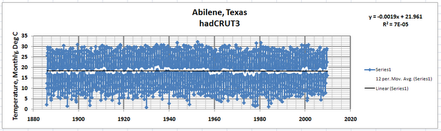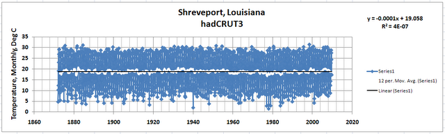 An diesem Punkt schaute ich auf benachbarte Städte und fand, dass einige davon, wie ich oben schrieb, einen abkühlenden oder neutralen Trend zeigten. Abilene, Texas, und Shreveport, Louisiana, sind zwei davon. In Abilene zeigt sich eine Abkühlung von 0,19°C pro Jahrhundert, während Shreveport eine solche von 0,01°C pro Jahrhundert, also fast gar keine Änderung, zeigt. Diese beiden Städte liegen etwa 250 Meilen [ca. 402 km] in Ost-West-Richtung voneinander entfernt. Sie liegen etwa auf gleicher geographischer Breite. Gleichzeitig zeigt sich in St. Louis, Missouri, eine Erwärmung von etwa 1°C pro Jahrhundert. St. Louis liegt nur etwa 300 Meilen [ca. 480 km] nördlich und ein wenig östlich von Shreveport und etwa 400 Meilen [ca. 640 km] von Abilene entfernt. Klarer Fall, bei der CO2-verursacht-globale-Erwärmung-Wissenschaft stimmt hier irgendetwas nicht. Woher weiß das CO2, dass es Shreveport außen vor lässt und seine Erwärmungswirkung auf St. Louis konzentriert?