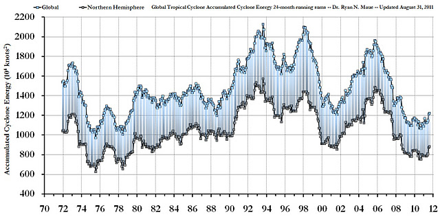 Viertens, Hurrikane werden nicht immer häufiger und stärker. Tatsächlich war die derzeitige Hurrikanaktivität seit Beginn von Satellitenbeobachtungen noch nie so gering. Inzwischen steigt der CO2-Gehalt immer weiter. Eine weitere Fehlvorhersage, die beweist, dass ihre Gedanken kompletter Unsinn sind. Die Karte unten stammt von Dr. Ryan Maue von der Florida State University und zeigt den gegenwärtigen Status der Tropischen Zyklone weltweit, gemessen als Accumulated Cyclone Energy von 1972 bis heute. Die obere Linie steht für die ganze Welt, die untere für die Nordhemisphäre. Die Gesamtenergie liegt jetzt wieder auf einem Niveau wie Mitte der siebziger Jahre, und der CO2-Gehalt steigt immer weiter.