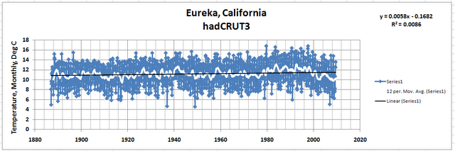 Ich möchte mich kurz zu der faszinierend kleinen Stadt Eureka in Kalifornien zuwenden. Ich war niemals dort, und es liegt an der Pazifikküste zwischen San Francisco und der Grenze zum [US-Bundesstaat] Oregon. Sollten dort 2075 olympische Winterspiele stattfinden, sollte das Städtchen im Angebot verlorener Städte stehen. Schon bald sollte dort nämlich das ganze Jahr über Schnee liegen und eine lokale Eiszeit ausbrechen, wenn sich der gegenwärtige Abkühlungstrend nicht umkehrt. Seit 1990 gab es nämlich dort eine Abkühlung mit einer Rate von 15°C pro Jahrhundert. Die Mitteltemperatur liegt gegenwärtig bei etwa 10°C und wird in 65 Jahren bei 0°C liegen. Man kann sich nur wundern, warum das CO2 die Kleinstadt Eureka übersehen hat. Falls irgendeine Stadt dringend eine globale Erwärmung braucht, wäre es Eureka.