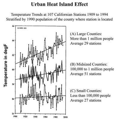 Scließlich wurde mein Augenmerk auf eine veröffentlichte Studie von Dr. James Goodbridge gelenkt, dem früheren staatlichen Klimatologen für Kalifornien, inzwischen im Ruhestand. Seine Arbeit zeigte, dass die Landkreise Kaliforniens in drei Gruppen hinsichtlich der Bevölkerungsdichte eingeteilt werden können. Dann hat er für jede der drei Gruppen den mittleren Temperaturtrend errechnet. Er zeigt, dass Landkreise mit großer Bevölkerungszahl deutlich zunehmende Temperaturen über 80 Jahre aufweisen, während jene mit geringer Bevölkerung überhaupt keine wesentliche Erwärmung zeigen. In Landkreisen mit mittlerer Bevölkerungszahl lag die Erwärmungsrate etwa in der Mitte. Man muss sich ernsthaft fragen, wie das CO2 das bewerkstelligen konnte. Typischerweise liegen die großen Städte alle an der Küste, z. B. San Diego, Los Angeles und San Francisco. Landkreise mit kleiner Bevölkerungszahl sind über den ganzen Staat verteilt, einschließlich in den küstennahen Gebieten ohne große Städte. Es ist höchst unwahrscheinlich, dass das CO2 schlau genug ist, um sich die Landkreise für seine Wärmestrahlung auszusuchen und andere zu ignorieren.