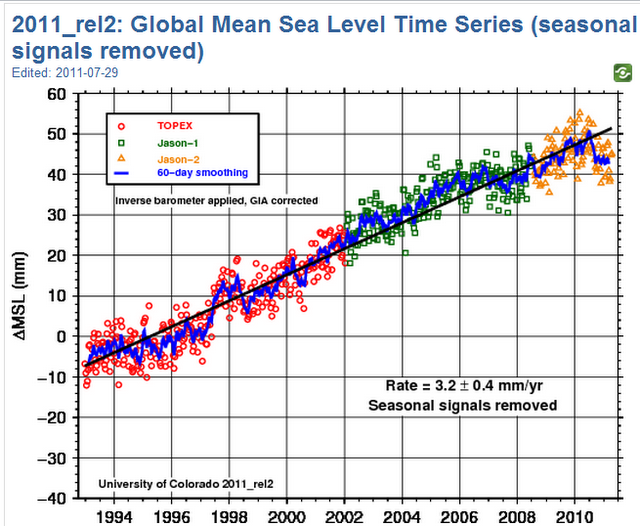Zunächst einmal, der Meeresspiegel steigt nicht, und die Ozeane werden nicht wärmer. Dies allein widerlegt bereits den gesamten CO2-Erwärmungsunsinn. Dem Glauben der Warmisten zufolge müssten die Ozeane wärmer werden und der Meeresspiegel mit zunehmendem CO2-Niveau steigen. Nichts davon passiert. Die Daten von NASA und NOAA selbst zeigen das ganz klar. Die Graphik unten stammt von U. Colorado und basiert auf Satellitenmessungen des Meeresspiegels der Nasa. Man beachte den stark abnehmenden Trend seit 2005 und die plötzliche Abnahme Anfang 2010.