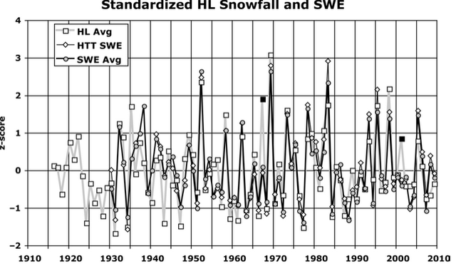 Die nächste Abbildung zeigt, dass sich die Schneebedeckung der Sierra Nevada und das Schnee-Wasser-Äquivalent während der letzten 100 Jahre nicht signifikant verändert hat. Dr. John Christy von der University of Alabama, Huntsville, hat 2010 hierzu eine Studie veröffentlicht. Seine Daten enden 2009. Seitdem hat es rekordverdächtige Schneefälle in den Sierras gegeben. Sein grundlegender Graph ist unten zu erkennen, geglättet, um die Abweichung der Schneebedeckung vom Mittel zu zeigen. Diese Studie bezieht sich auf die zentrale Schneemessstation am Huntington Lake HL. Die Studie gibt es hier.