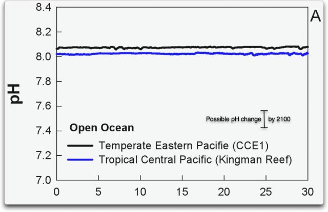Man vergleiche die beiden in Abbildung 1 gezeigten Regionen mit einigen anderen „Schnappschüssen“ von Korallenriffen mit dreißig Tage langen PH-Wert-Messungen.