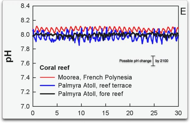Ein paar Dinge sind in Abbildung 3 bemerkenswert. Erstens, die Variation des PH-Wertes zwischen Tag und Nacht stammt von dem CO2, dass durch das Riffleben als ganzes gebildet wird. Auch beträgt die Schwingung von Tag zu Nacht im Palmyra-Riff etwa ein Viertel einer PH-Wert-Einheit… was bereits um 60% höher liegt als die projizierte Änderung durch CO2 bis zum Jahr 2100.