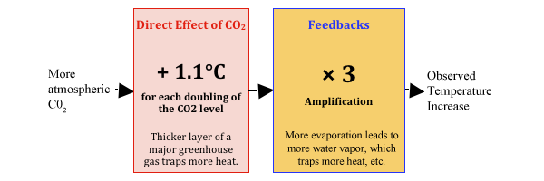 Rückkopplungen treten auf wegen der verschiedenen Arten, mit denen die Erde auf den direkten Erwärmungseffekt durch das CO2 reagiert. Die dreifache Verstärkung der Rückkopplungen basiert auf der um das Jahr 1980 entstandenen Hypothese oder der Vermutung, dass mehr Erwärmung durch CO2 zu größerer Verdunstung der Ozeane führt und das dieser zusätzliche Wasserdampf wiederum zu größerer Rückhaltung von Wärme führt, weil Wasserdampf das wesentliche Treibhausgas ist. Und zusätzliche Wärme ergibt noch mehr Verdunstung, und so weiter. Diese Verstärkung berechnen alle Klimamodelle. http://wattsupwiththat.com/2012/02/26/the-skeptics-case/ – sdendnote3sym3